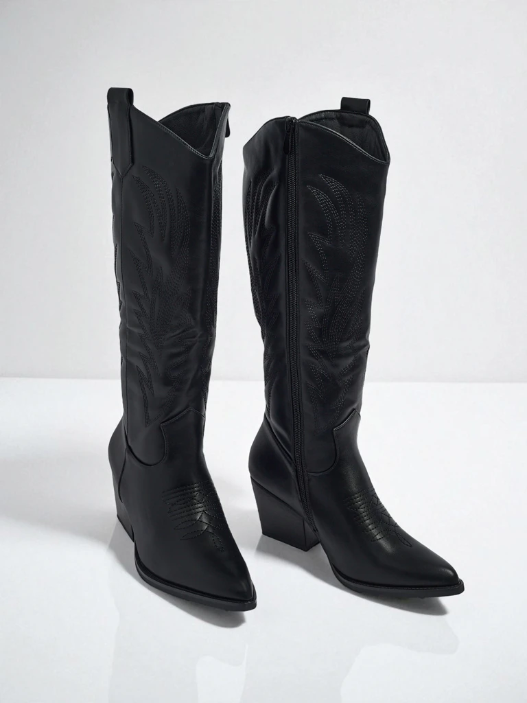 - Cowboy-style heeled boots made of ecological suede leather. The footwear is zippered and has a fabric lining. They match many women's styles!