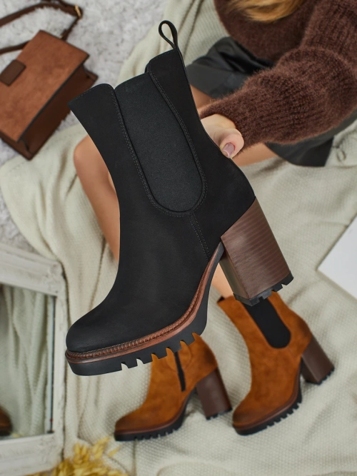 The shoes are made of black leather, which gives them a classic look. The upper is enhanced with elastic inserts, making them easy to put on and take off. The high heel practically enhances the style while providing stability when walking. The materials used and attention to detail make the ankle boots not only look good but are also durable and resistant to damage.