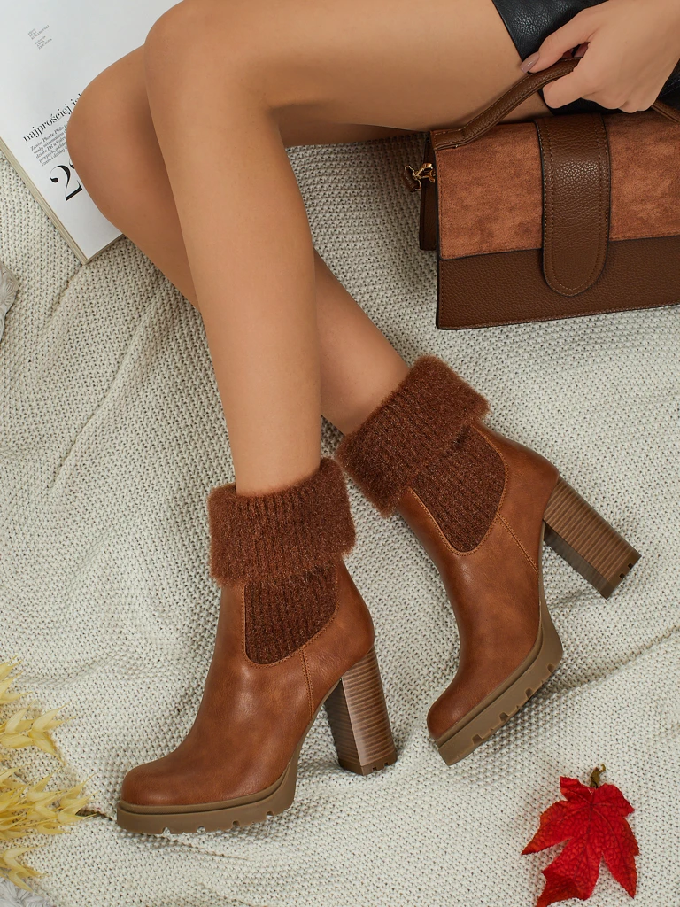 - Comfortable heeled ankle boots, made of eco-leather with a knitted insert. Slip-on model. The model is gently insulated with fur. An ideal choice for autumn!