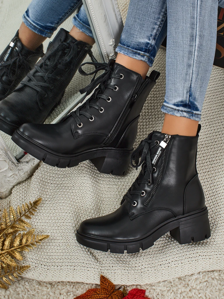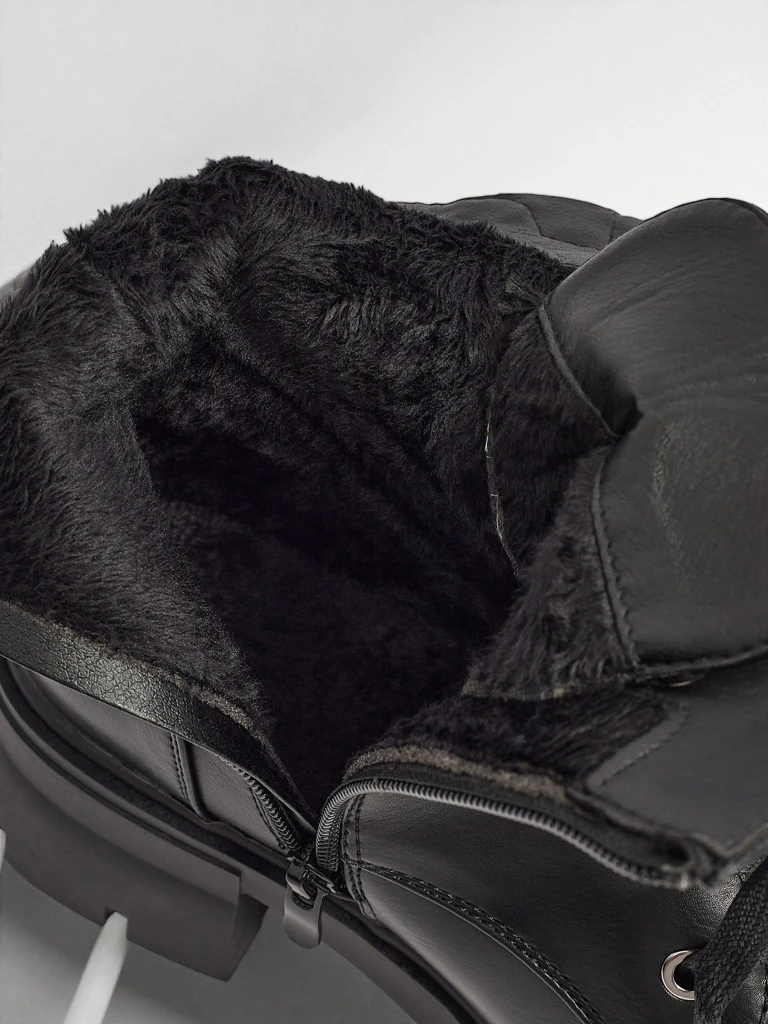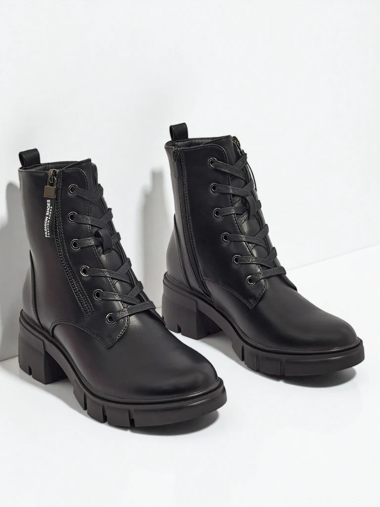 - Women's ankle boots made of eco-leather, with a zipper, lacing, and a round toe. Additionally, they feature fur lining - modernity, comfort, and style in one.