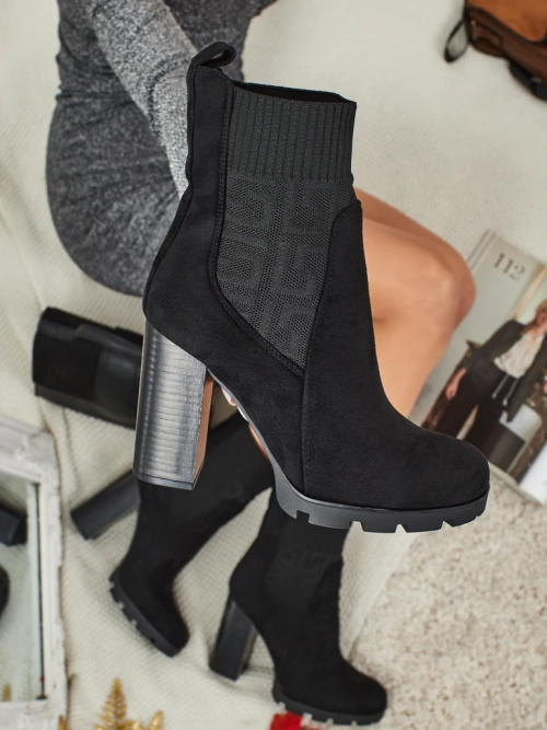 • Comfortable ankle boots with a high block heel, made of eco-suede leather and fabric insert. Slip-on model. The model is gently insulated with fur. An ideal choice for autumn!