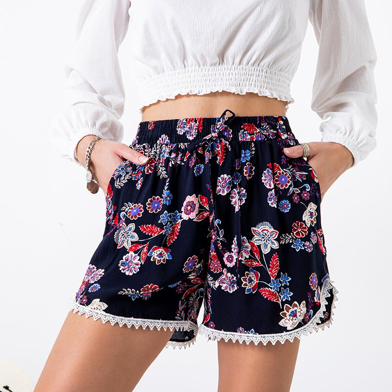 Mereväesinised naiste lühikesed lühikesed püksid punaste lilledega - Rõivad