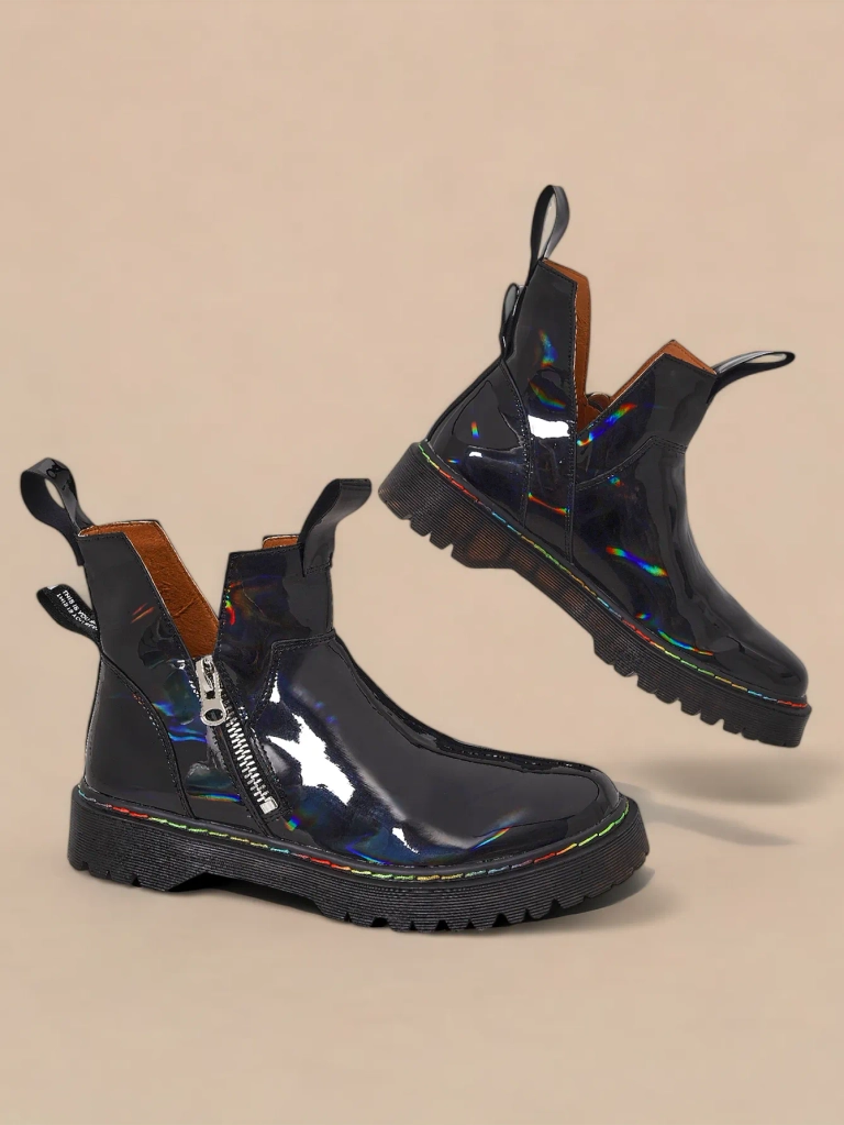 Naiste poolsaapad, mis on valmistatud kummisegu ja holograafilise motiiviga öko-nahast. Soojustuseta mudel, sisetald on kaetud öko-nahaga. Küljel on väljalõiked ja tõmblukk. Ideaalne naiste jalats jahedamateks päevadeks!