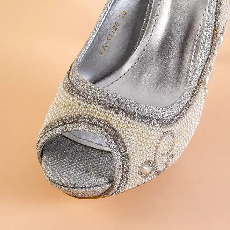 - Sensatsioonilised naiste stilettpumbad, mis on kaunistatud tsirkoonide ja pärlitega. Mudel on valmistatud glitteriga kaetud kangast materjalist, sisetald ökoloogilisest nahast. Märkus: tootel on materjalil liimijäljed.