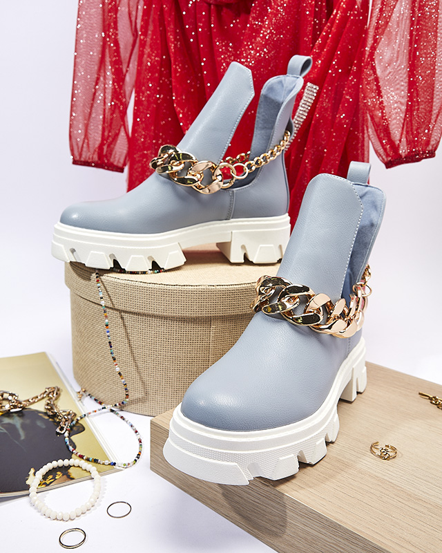 - Stiilsed naiste saapad metallist ketiga, kindla tallaga. Väljalõikega pealne on ökoloogilisest nahast, sisetald on samuti ökoloogilisest nahast. Need sobivad paljude originaalsete stiilidega.
