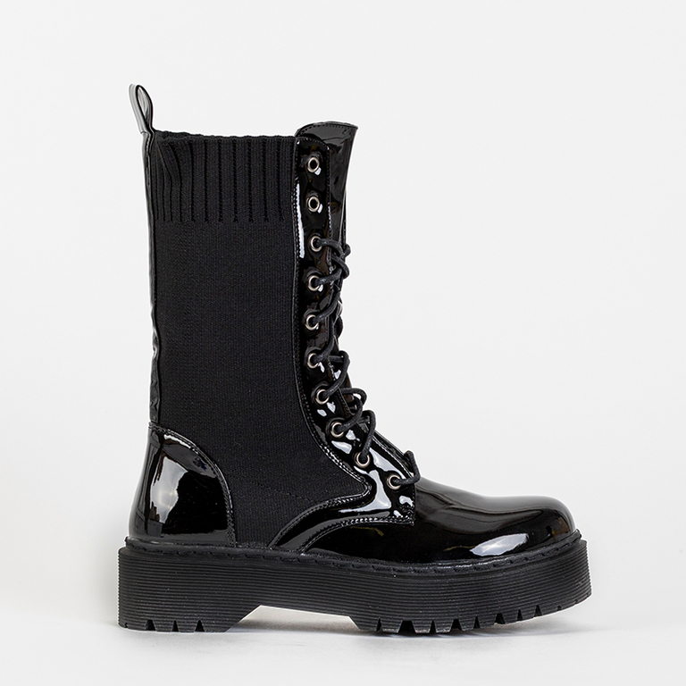 - Stiilsed kotid, mis on valmistatud lakknahast ja elastsest kangast. Sisetald on valmistatud karvasest materjalist. Pitsmudel. Jalanõud on platvormiga ja ulatuvad kuni vasika keskkohani. MUSTAD TALVESAAPAD SAAPAD ISOLEERIMATA KIKIZO
