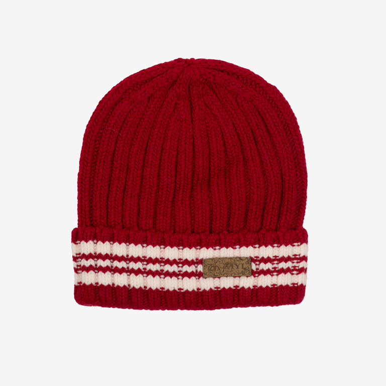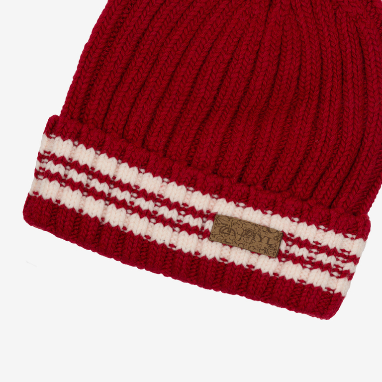 • Damska czapka typu beanie z prążkowanej dzianiny. Na czubku ozdobny pompon. Nie posiadają ocieplenia.