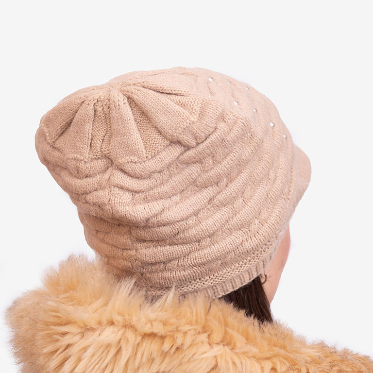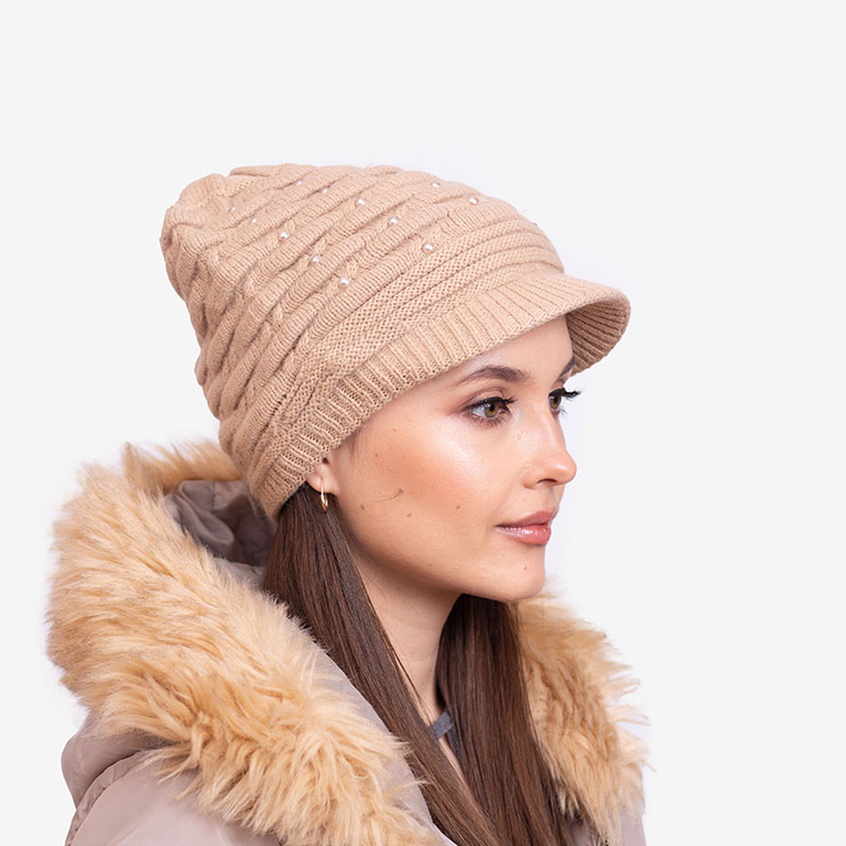 - Warm ond soft womon's double-loer winter hat. Model with a peak, without lining ond decorated with pearls. Perfect for cold ond winter doys!