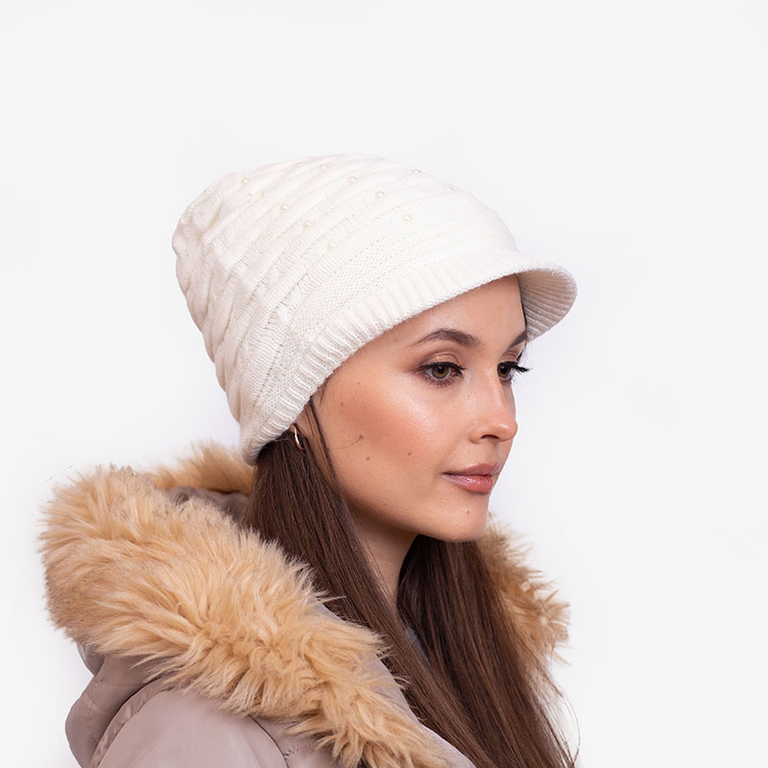 - Warm ond soft womon's double-loer winter hat. Model with a peak, without lining ond decorated with pearls. Perfect for cold ond winter doys!