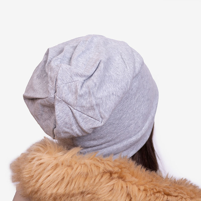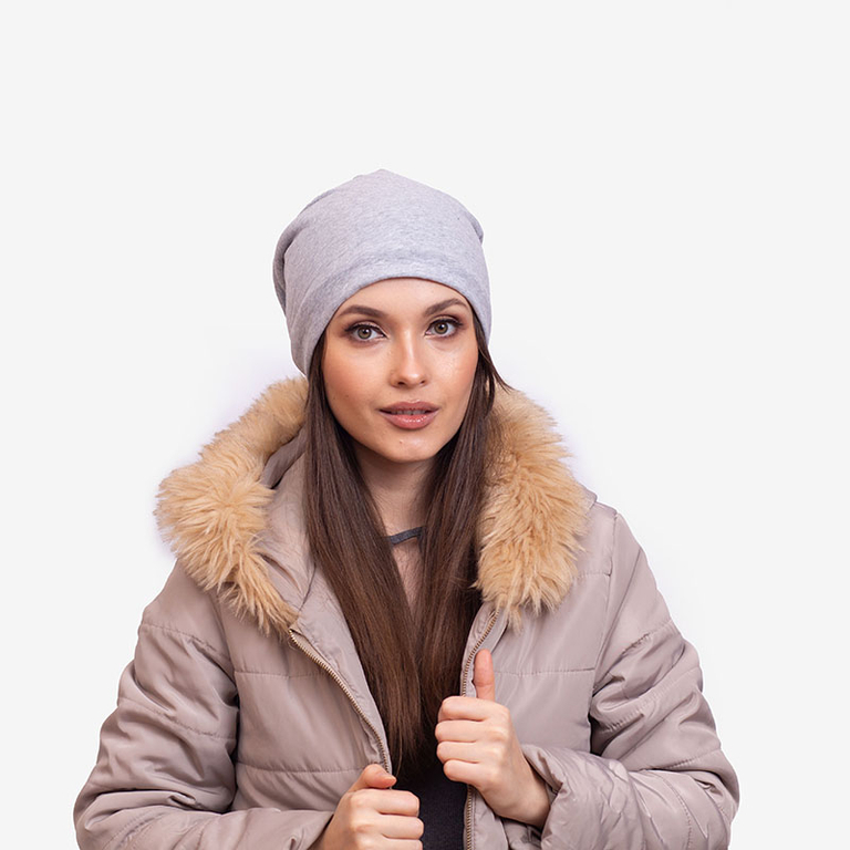 • Damska czapka typu beanie z prążkowanej dzianiny. Na czubku ozdobny pompon. Nie posiadają ocieplenia.