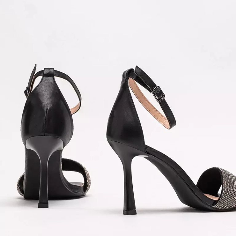 - Kaunid tsirkoonidega kaunistatud naiste stilettosandaalid. Paar on täielikult valmistatud keskkonnasõbralikust nahast. Ümber pahkluu on reguleeritav rihm, mis kinnitub luku abil. Märkus: toode on katkise materjaliga.
