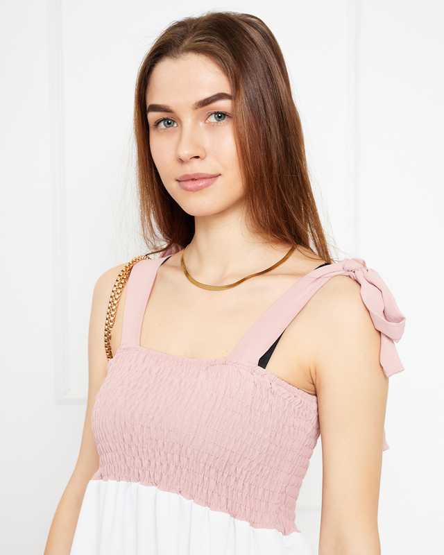 - Seotavate rihmadega naiste minikleit. Kolmevärviline mudel on sirge kaelusega ja volangidega. Ideaalne suvepäevadeks!