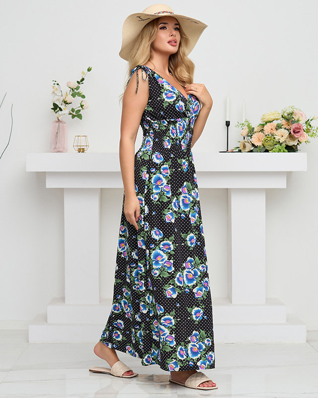 - Elastsest kangast õhuline naiste täppide ja lillemustriga maksikleit. Mudelil on laiad rihmad, taljet rõhutav pinguldav elastik. MÄRKUS: Mõõtmistäpsus (+/-) 1 cm.
