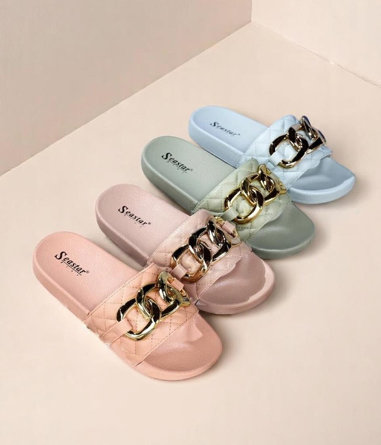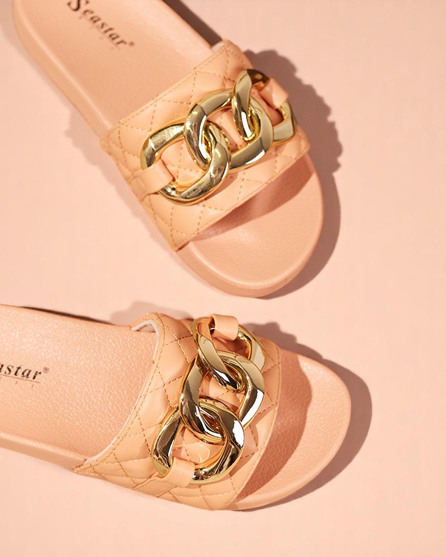 - Tepitud ökoloogilisest nahast selle hooaja moodsaimad naiste sussid. Mudelit kaunistab suur kuldset värvi plastikkett. Sisetald ja tald on valmistatud kummimaterjalist. Suurepärane täiendus teie suvistele vabaajarõivastele!