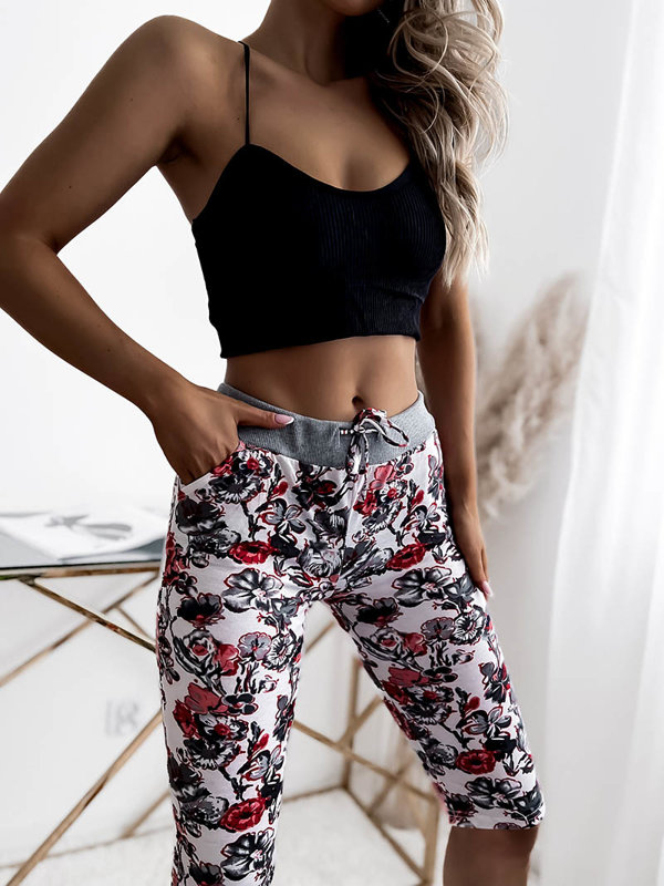 - Mugavad naiste 3/4 taskutega lühikesed püksid, puuvillasest riidest lilledega. Mudelil on vöökohal kumm ja sõlmedega rullikud. MÄRKUS: Mõõtmistäpsus (+/-) 1 cm.