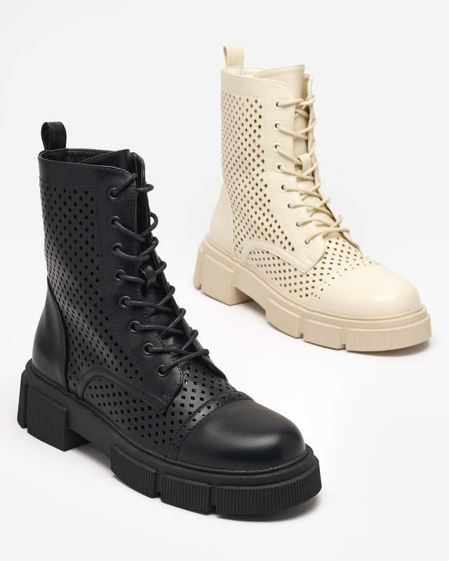 • Ažuurse viimistlusega unikaalsed naiste saapad ökoloogilisest nahast. Kinga sisemus on vooderdatud ökoloogilise nahaga. Kingad on nööritud ja kinnituvad külgedelt tõmblukkudega. Ideaalne paar boho stiilis välimuse jaoks. BEEŽID NAISTE KINGAD VEETAMATA SÜH