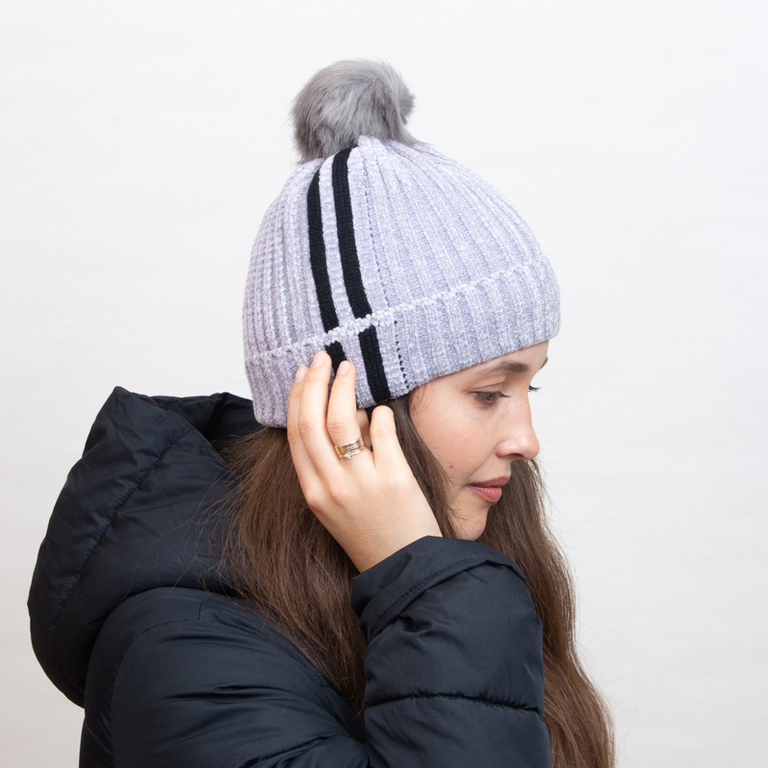 - Ilus naiste isoleeritud talvemüts, mis on valmistatud trikookangast ja veluurist kaunistusega. Mudel on pehme karusnahast voodriga, kaunistatud küljel olevate triipude ja sobivas värvitoonis koheva pomponiga. Ideaalne külmadeks ja talvepäevadeks!