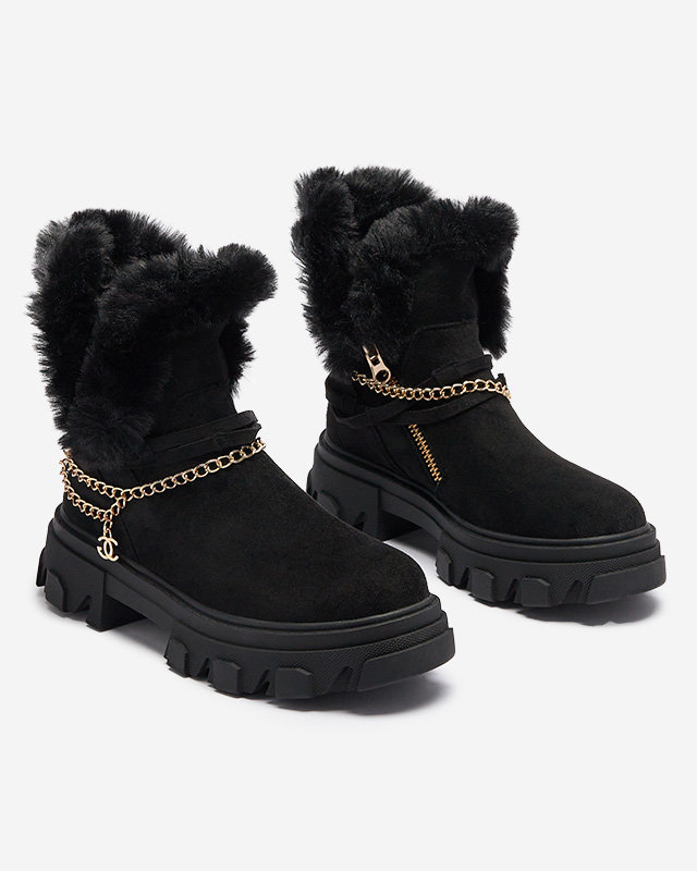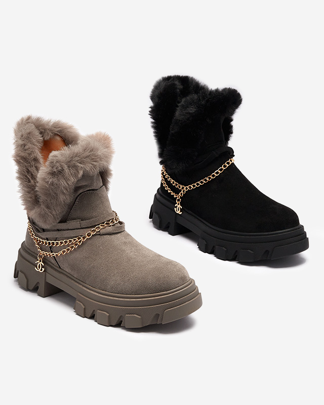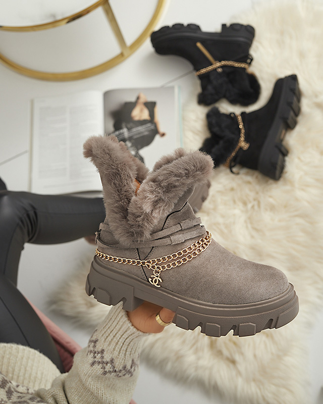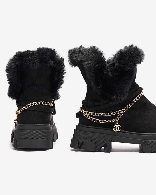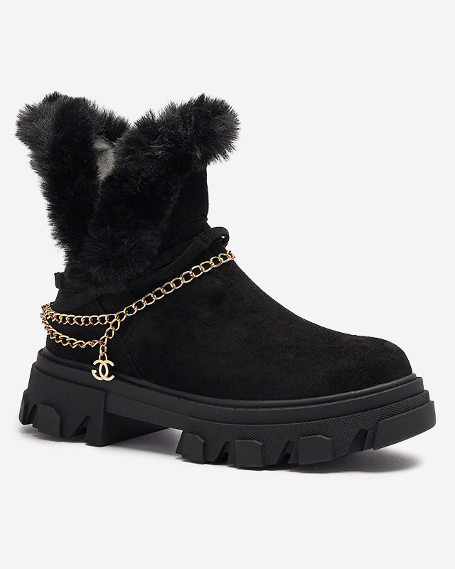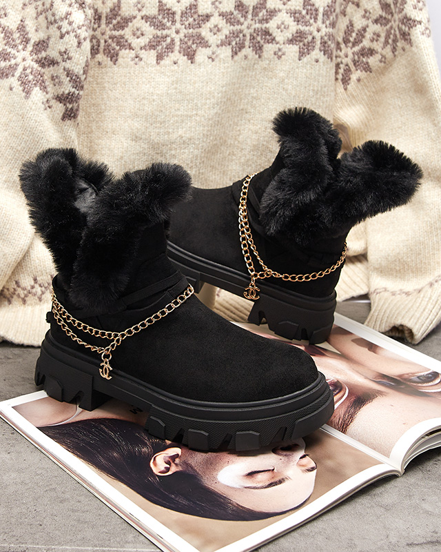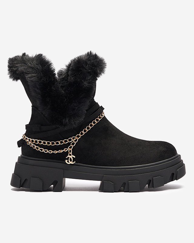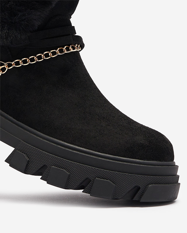 • Ajatu naiste lamedakandilised saapad, mis on kaunistatud kuldse ketiga. Paar on valmistatud ökoloogilisest mokkanahast, keskosa on osaliselt soojustatud pehme karusnahaga. Küljel on tõmblukuga sulgemine. MUSTAD ISOLEERITUD VIDERIC-SAAPAD