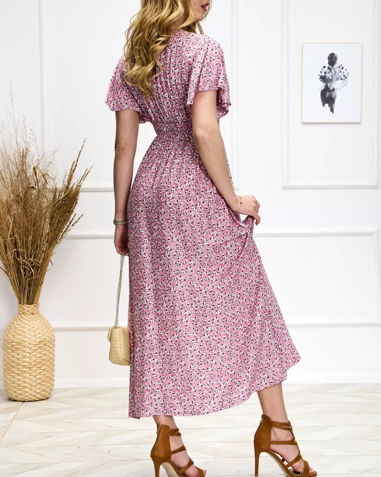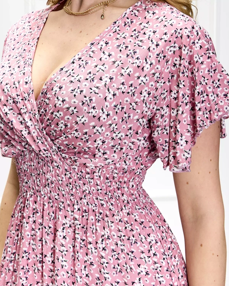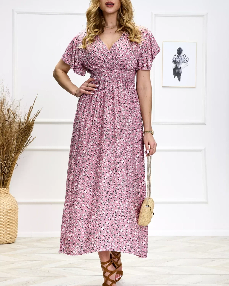 - Naiste lilleline midi-pikk kleit, mis on valmistatud pehmest ja mõnusast riidest. Mudelil on ümbrikukaelus, lühikeste varrukatega ja laia kummiga, mis rõhutab vöökohta. Sinu garderoobi asendamatu element! MÄRKUS: mõõtmistäpsus (+/-) 1 cm.