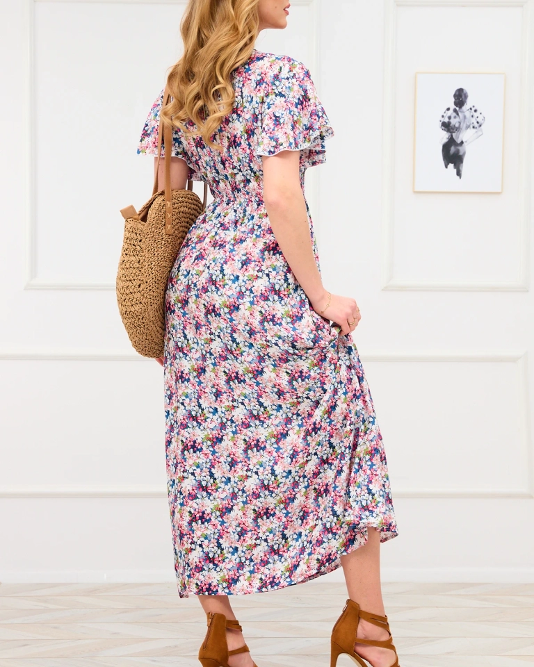- Kaunis naiste maxikleit. Mudelil on lühikesed varrukad, ümbrikukaelus ja elastne vöökoht. Pehme, meeldiv kangas on kaetud lillemustriga. Ideaalne stiilse outfiti loomiseks!