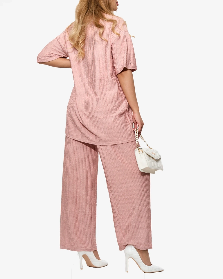 - Naiste komplekt venivast triibukangast. Lühikeste varrukatega ja ümmarguse kaelusega pluus. Pikad palazzo püksid kõrge vöökohaga, kummipaelaga ja vöökohasõlmedega. Stiilne ja mugav kombinatsioon! MÄRKUS: mõõtmistäpsus (+/-) 1 cm.