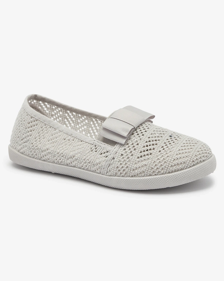 - Ilusad tüdrukute slip on tossud. Pealne on valmistatud auklikust kangast materjalist, sisetald on samuti kangast. Paar on kaunistatud imearmsate vibudega esiosas. Lisaks on kingadel kummist sissekanne, et jalga oleks lihtne kinga sisse libistada.