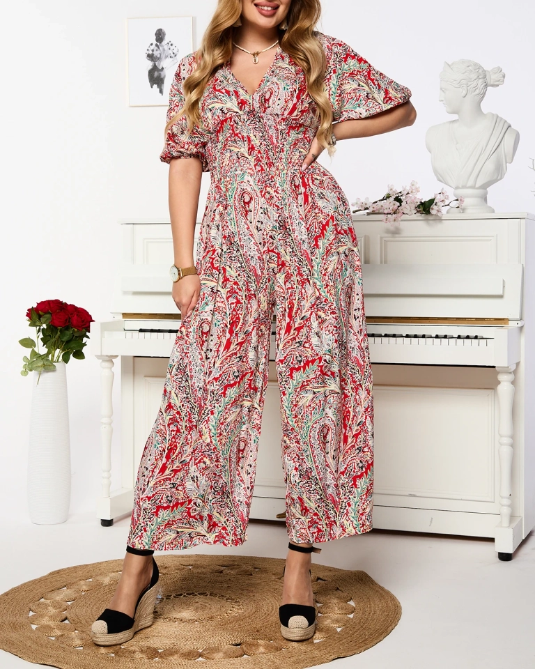 - Mustriline mustriline naiste lühikeste varrukatega kombinesoon. Mudel on ümbrikukaelusega, seljas paelaga ja laia elastse vöökohaga. Tootel on laiad, pikad sääred. MÄRKUS: mõõtmistäpsus (+/-) 1 cm.