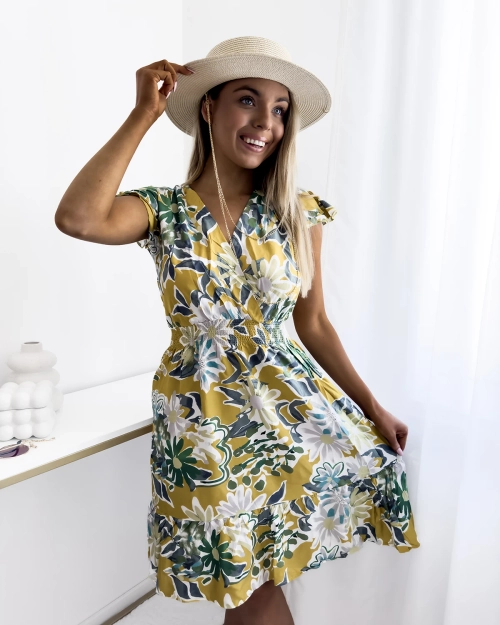- Naiste minikleit, mis on valmistatud kergest kangast ja kaunistatud lillemustriga. Mudel on ümbrikukaelusega ja elastse vöökoha laiusega. Mudelil lühikeste varrukatega. Sobib suurepäraselt suveks! MÄRKUS: mõõtmistäpsus (+/-) 1 cm.