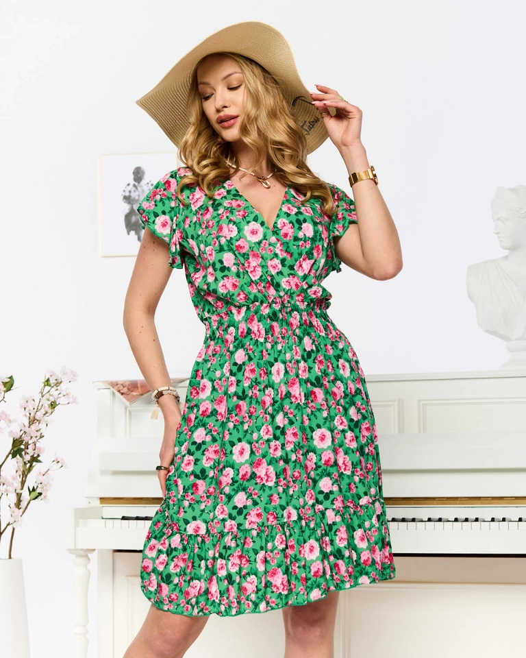 - Naiste lühike kleit, mis on valmistatud kergest kangast ja lillemustriga. Mudel on ümbrikukaelusega ja lühikeste varrukatega. Sellel on kummipael, mis rõhutab vöökohta. Ideaalne koos sandaalidega! MÄRKUS: mõõtmistäpsus (+/-) 1 cm.