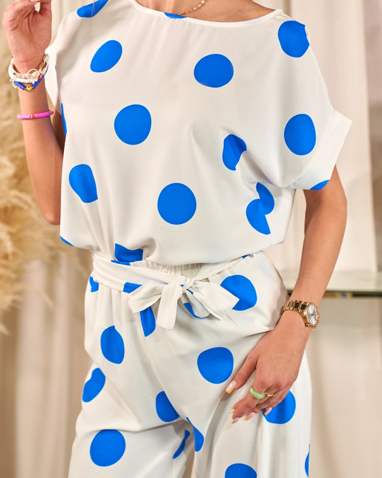 - Naiste komplekt, mis on valmistatud meeldivast, kergest hernekangast. Pluusil on lühikesed varrukad ja ümmargune kaelus. Kangast laiad püksid on varustatud elastse vöökohaga. Lisaks on kaasas kangast vöö. MÄRKUS: mõõtmistäpsus (+/-) 1 cm.