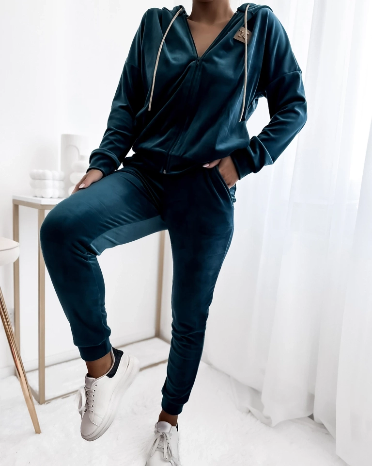 - Naiste dressipluuside komplekt, mis on valmistatud pehmest materjalist a'la veluur. Kampsun on kaunistatud plaastriga, sellel on kapuuts, seotud püksid ja 2 taskut. Püksid on laia elastse vöökohaga ja 2 liibuvat taskut. MÄRKUS: mõõtmistäpsus (+/-) 1 cm.