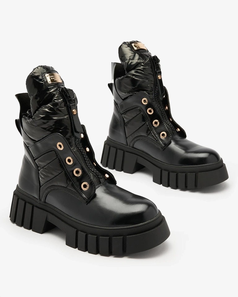 - Naiste saapad paksema tallaga. Pealne on valmistatud ökolakknahast ja a'la õlilakimaterjalist kombinatsioonist. Keskosa on täidetud pehme karusnahaga. Mudel kinnitub eest tõmblukuga. MUSTAD NAISTE ISOLEERITUD SAAPAD SELILKA