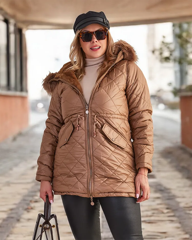 - Naiste tikitud jakk enne põlve. Sellel mudelil on karusnahaga kapuuts ja kaks taskut. Jope on kinnitatav tõmblukuga. Mudel on isoleeritud karusnahaga all ja tal on pingutuspaelaga vöökoht. See sobib suurepäraselt sügisese ilmaga.