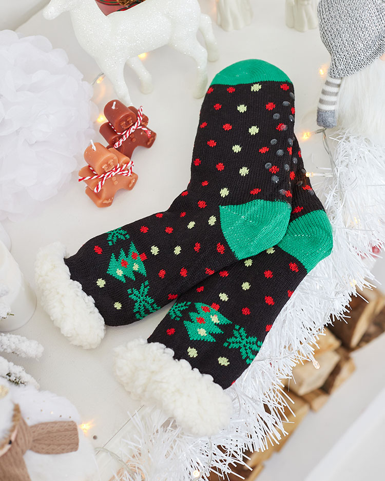 • Ilusad naiste paksud sokid, mis on viimistletud jõulumustriga ja millel on libisemisvastane põhi. Seest soojustatud valge sooja lambanahaga. Sokid sobivad suurepäraselt külmemateks õhtuteks.