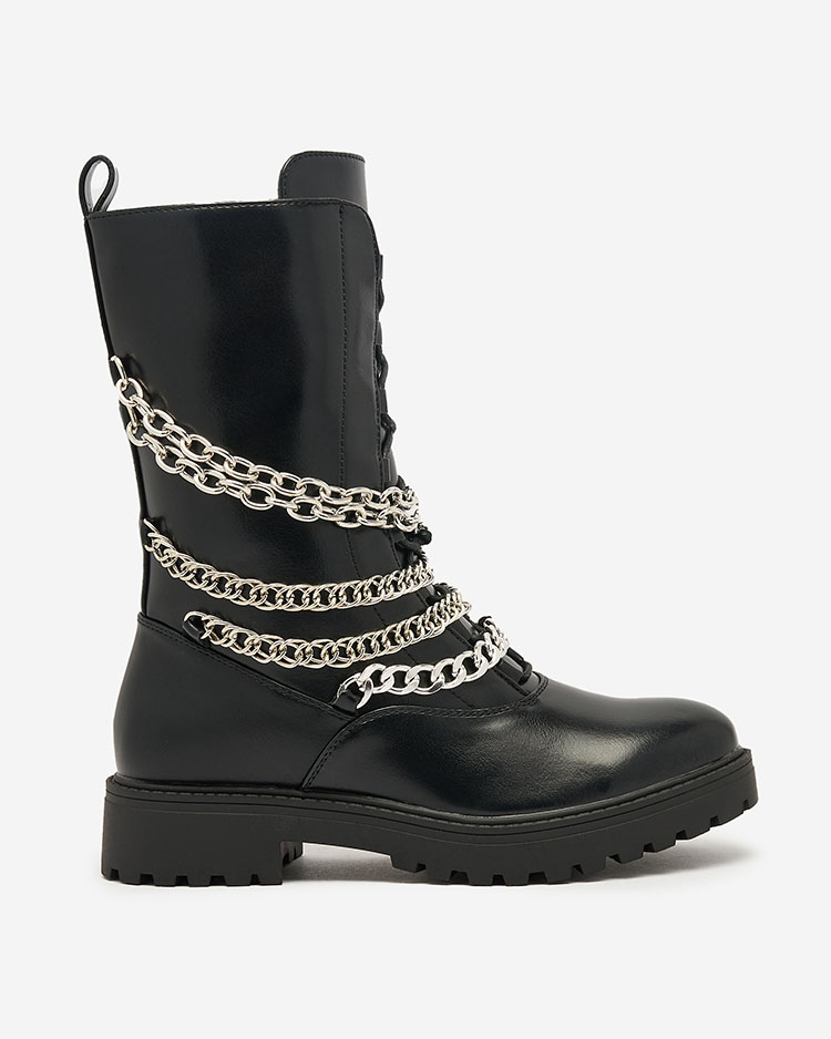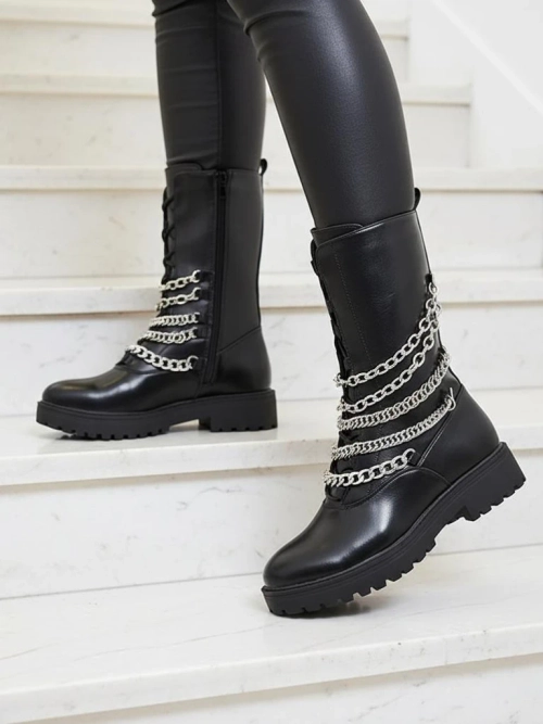 - Naiste baggerisaapad kindla tallaga. Pealne on valmistatud orgaanilisest nahast, kaunistatud ketiga ja isoleeritud karusnahast seestpoolt. Pitsmudel ja küljel tõmblukuga. Suurepärane valik külmemateks päevadeks!