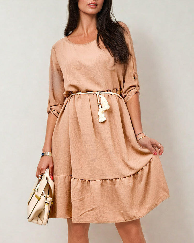 - Pikkade, rullitud varrukatega ja ümmarguse dekolteega vabaaja naiste põlvini ulatuv kleit. Lisaks on kaasas vöö. Selle hooaja must have! MÄRKUS: mõõtmistäpsus (+/-) 1 cm. Mõõtmed mõõdetud lamades.