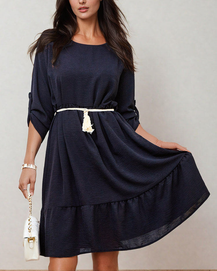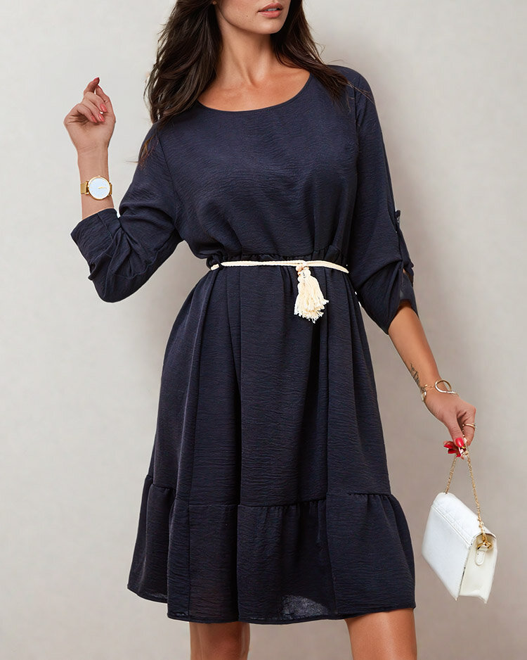 • Pikkade, rullitud varrukatega ja ümmarguse dekolteega vabaaja naiste põlvini ulatuv kleit. Lisaks on kaasas vöö. Selle hooaja must have! MÄRKUS: mõõtmistäpsus (+/-) 1 cm. Mõõtmed mõõdetud lamades.