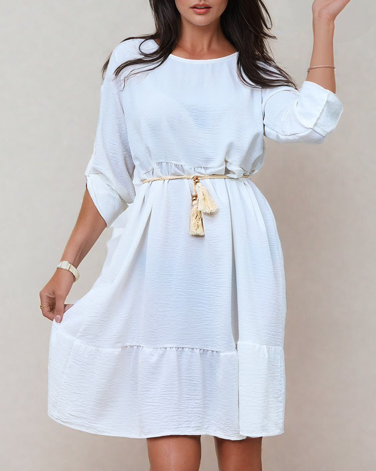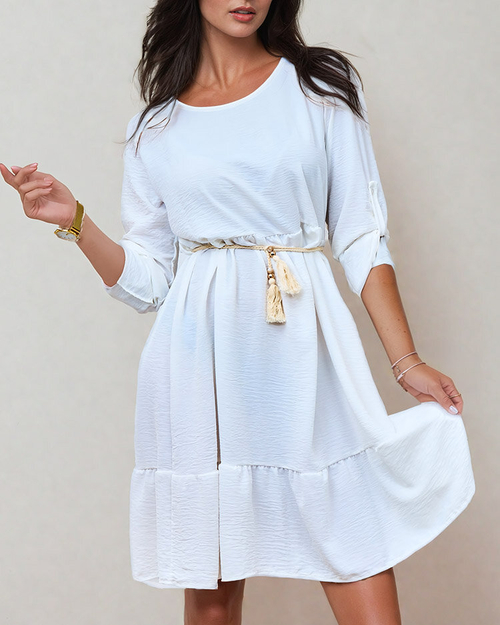 • Pikkade, rullitud varrukatega ja ümmarguse dekolteega vabaaja naiste põlvini ulatuv kleit. Lisaks on kaasas vöö. Selle hooaja must have! MÄRKUS: mõõtmistäpsus (+/-) 1 cm. Mõõtmed mõõdetud lamades.