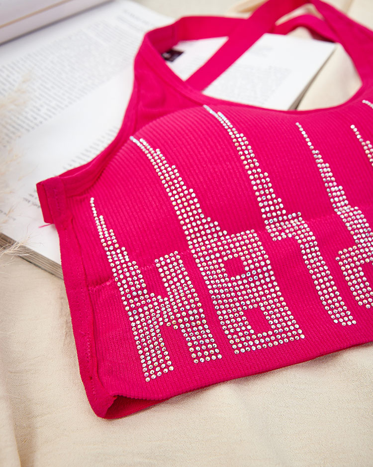 • Naiste spordirinnahoidja, mis on valmistatud elastsest, meeldivast materjalist. Reguleerimata, ristuvate rihmadega, ilma klambrita ja eemaldatavate sisestustega mudel, mis on lõpetatud laia kummiga altpoolt ja kaunistatud tsirkoonidega. Sobib ideaalselt k