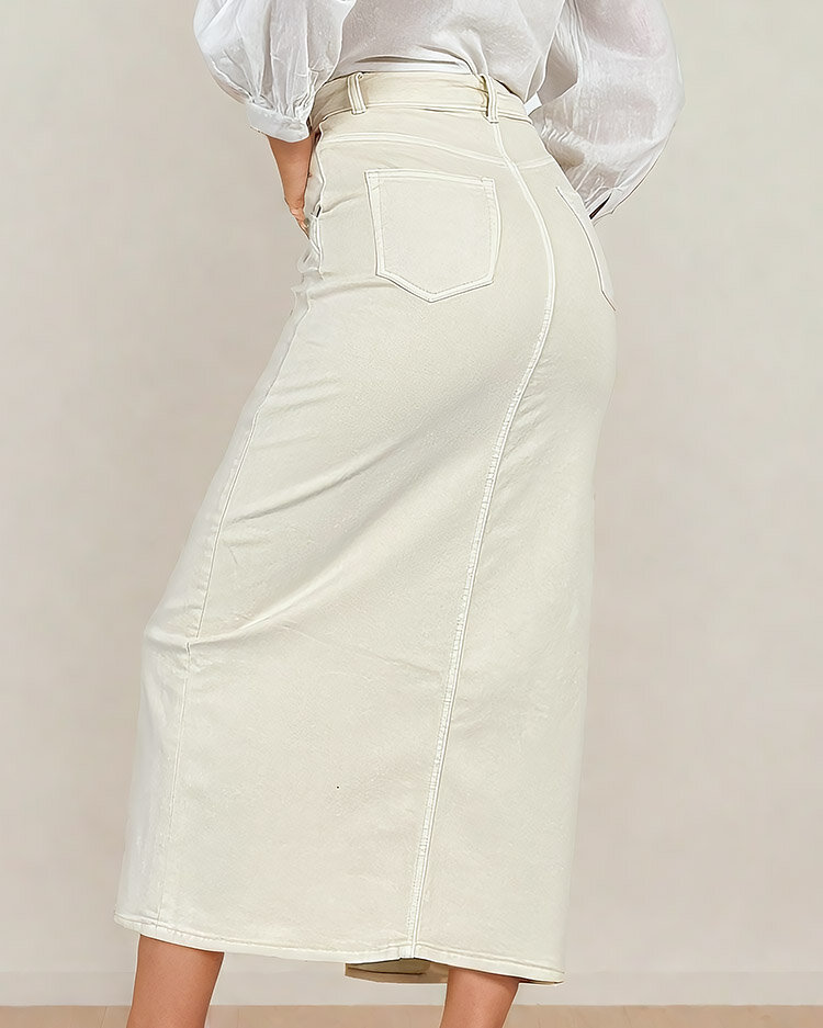 • Stiilne teksane naiste midi seelik, mudelil on 4 libisevat taskut ja nööbi- ning tõmblukuga sulgemine, ees pilu. MÄRKUS: mõõtmistäpsus (+/-) 1 cm.