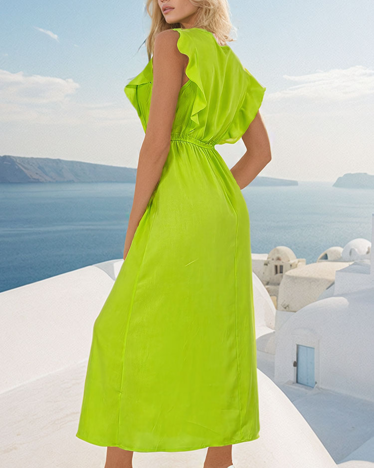 • Ühevärviline naiste midi pikkusega kleit, V-kaelusega toode, mis on kaunistatud nööpidega. Kleidil on lühikesed varrukad ja õhuke elastne vöökoht. Peab olema iga naise riidekapis! MÄRKUS: mõõtmistäpsus (+/-) 1 cm.