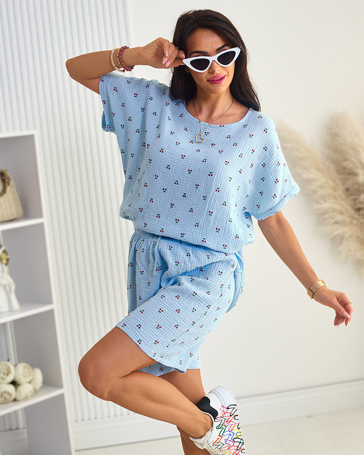 - Naiste komplekt meeldivast materjalist. Mudelil on dekoratiivne trükis. Lühikeste varrukatega pluus ja lühikesed püksid elastse vöökohaga. Tunne suve selles imelises komplektis!