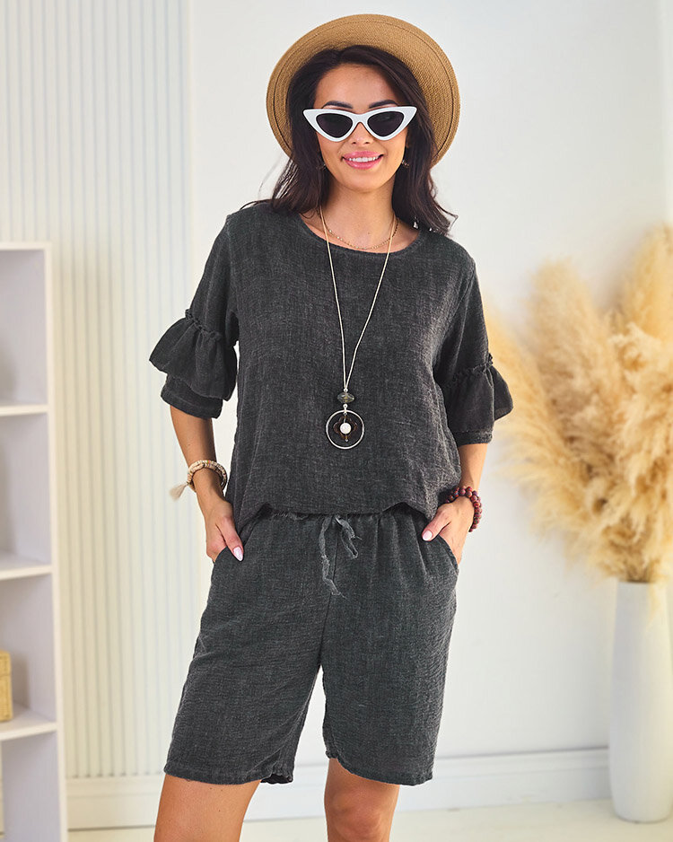 - Naiste komplekt meeldivast materjalist. Dekoratiivsete lühikeste varrukatega pluus ja elastse vöökohaga lühikesed püksid. Lisaks kuulub komplekti kaelakee. Tunne suve selles imelises komplektis!