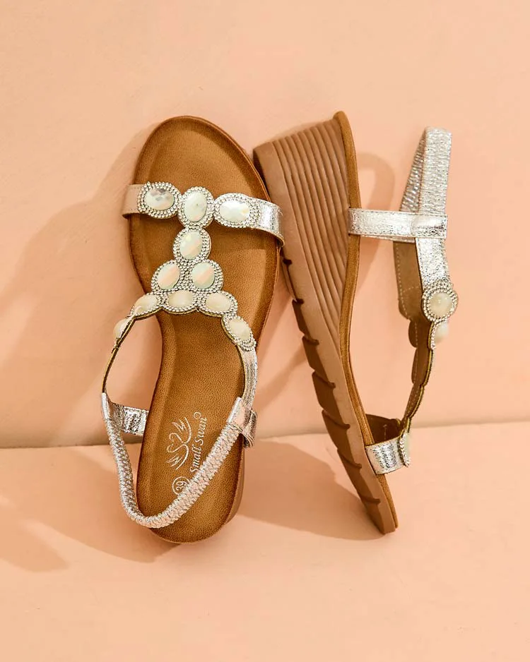 - Naiste sandaalid madala kontsaga- see on ideaalne idee kuumaks suvepäevaks. Mudel täielikult ökoloogilisest nahast. Pealne kaunistatud dekoratiivsete tsirkoonidega. Kanna neid lühikeste lühikeste pükstega!