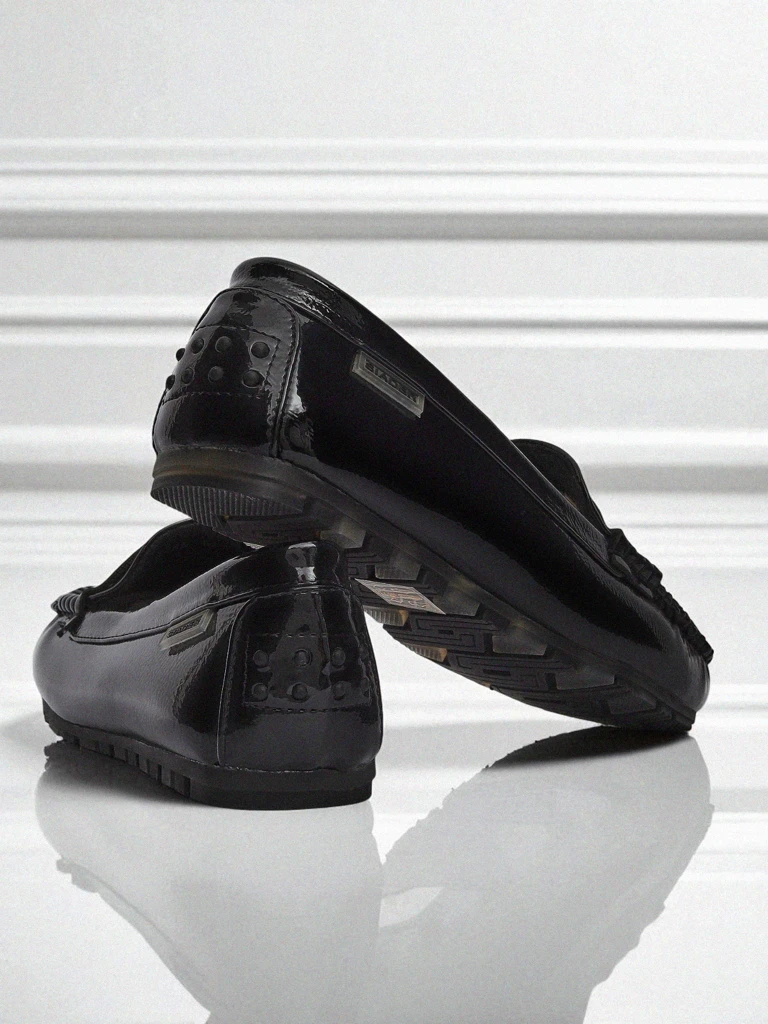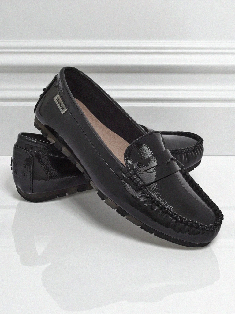 Klassikalised naiste mokassiinid tasasel tallal, valmistatud lakitud ökonahast. Sees pehmendustega naturaalsest nahast sisetald. Väga kerged ja mugavad!