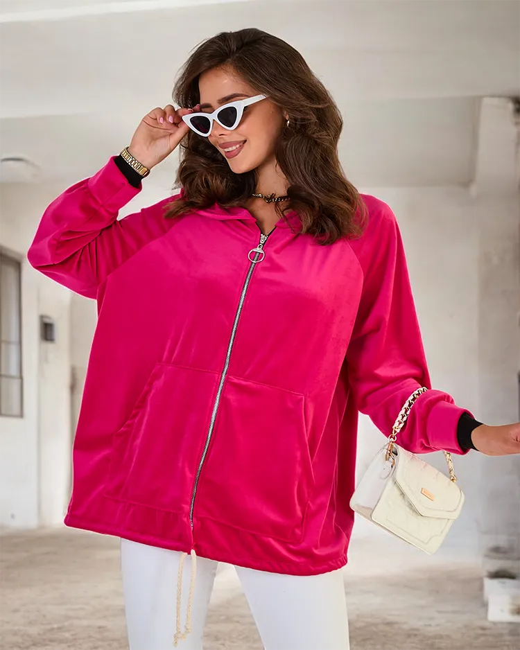 - Klassiline naiste a'la veluurist tõmblukuga dressipluus. Mudelil on kapuuts, kaks taskut ning õmblused allääres ja varrukatel. Sobib ideaalselt igale naisele! MÄRKUS: mõõtmistäpsus (+/-) 1 cm.