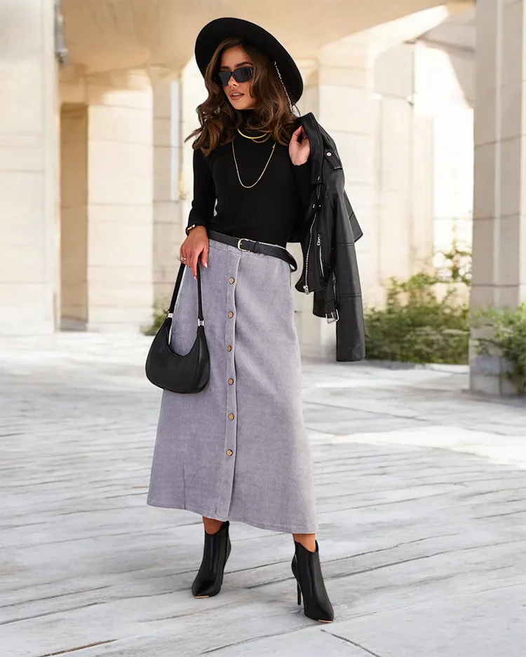 - Ajatu naiste midi pikkusega seelik. Mudelil on elastne vöökoht, mis rõhutab suurepäraselt vöökohta. Lisaks on lisatud dekoratiivsed nööbid ja vöö. See seelik on suurepärane aktsent sinu igapäevase välimuse juurde!
