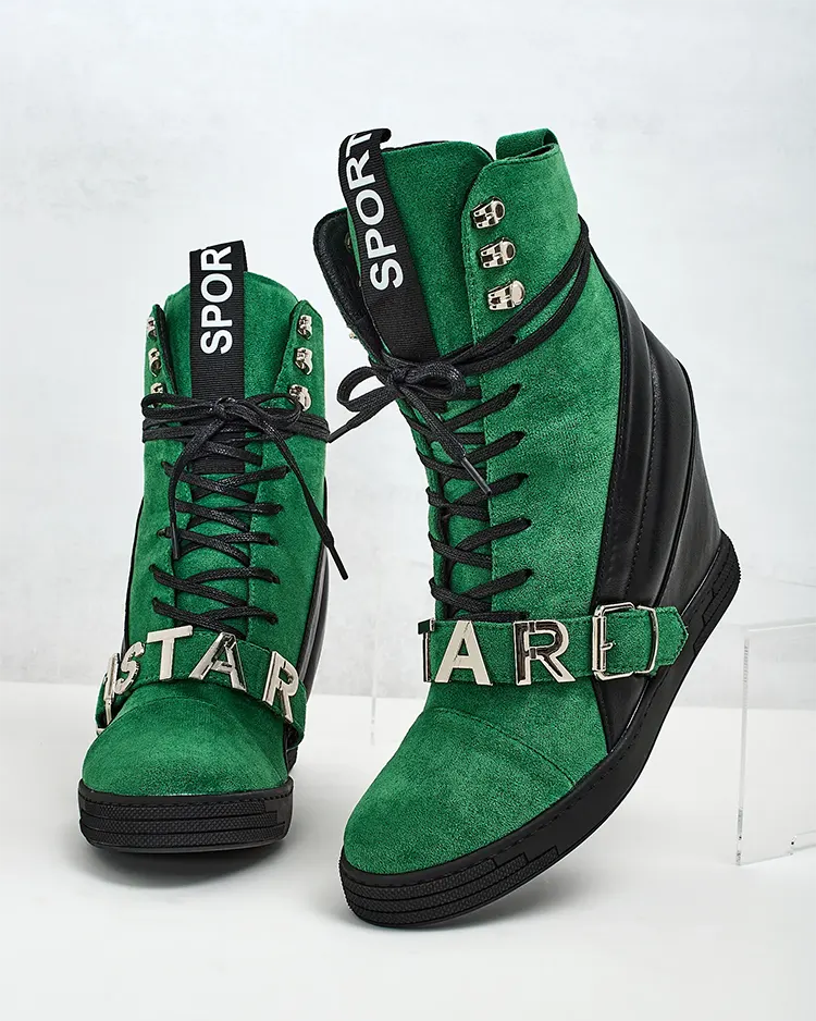 - Sportlikud naiste kontsaga saapad, mis on valmistatud ökonaha ja ökomudeli kombinatsioonist. Seotud jalanõud kaunistusega pealsel, kangast sisetald sees.