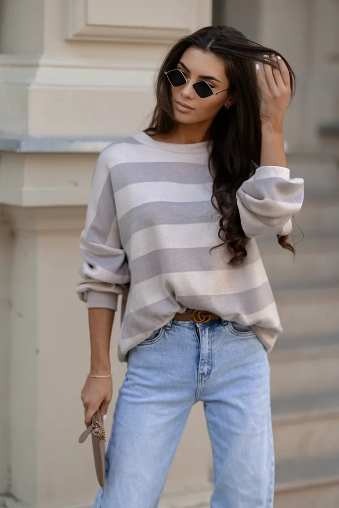 • Naiste meeldivast riidest triibumustriga ümmarguse kaelusega kampsun. Mudelil on pikad varrukad. Ideaalne alus talviseks riietuseks!