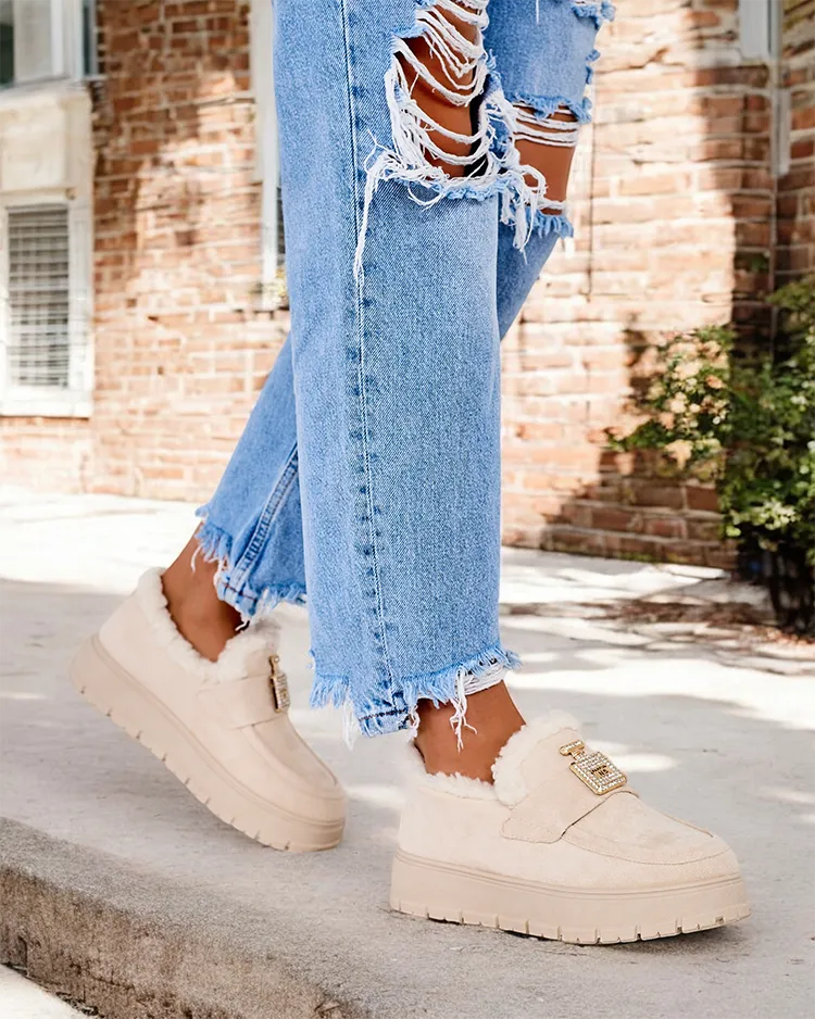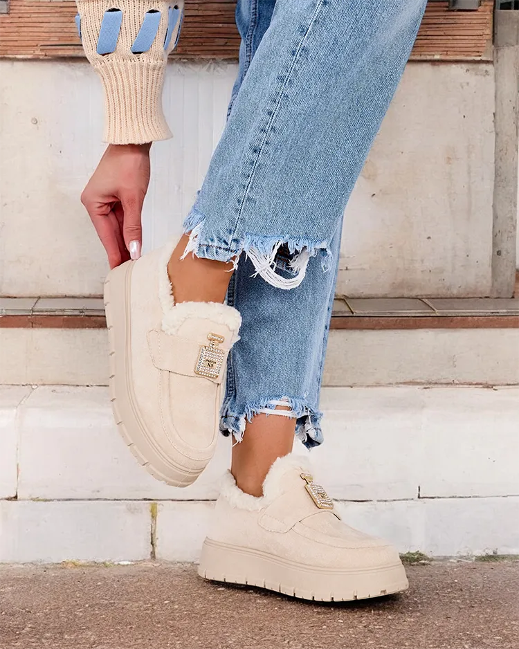 Ocieplane damskie mokasyny na platformie. Klasyczny model wykonany z zamszowej skóry ekologicznej oraz wypełnienia a' la kożuszek. Podeszwa w formie platformy. Na cholewce nie zdejmowana ozdoba z cyrkoniami.